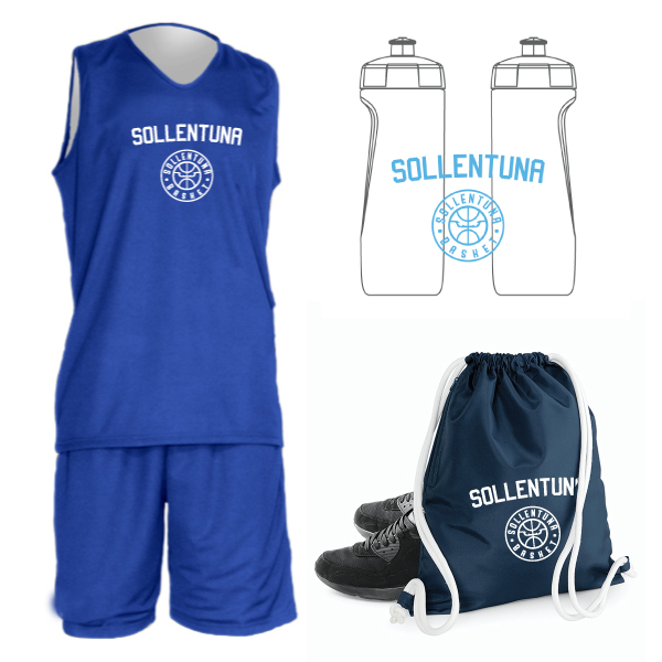 Sollentuna basket startpaket bestående av ett vändbart träningsset, en gymbag om 15 Liter och en vattenflaska om 700ml.